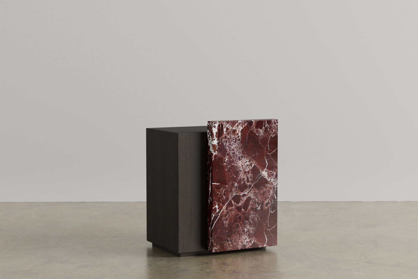 This side table combines a solid, compact wooden body with a single sliding stone panel making this a table with straightforward use of detail.